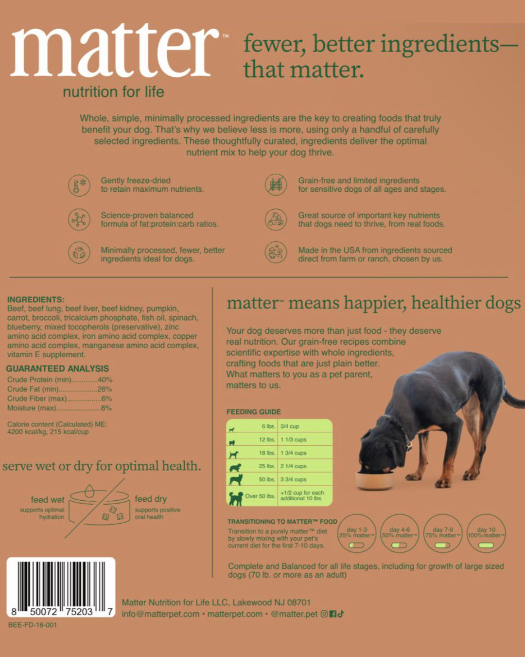 Rich, hearty, and packed with real-food nutrition. Matter’s Beef Freeze-Dried Recipe provides a satisfying source of complete protein and natural nutrients to help your dog thrive every day.