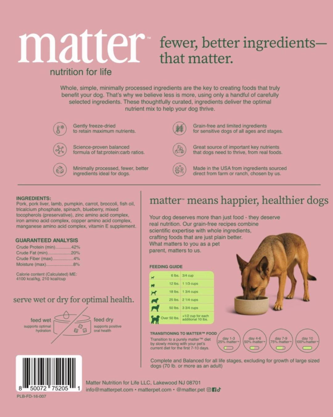 Bold flavor meets balanced nutrition. Matter’s Pork & Lamb Freeze-Dried Recipe combines two highly palatable, novel proteins for dogs who crave variety and thrive on quality. Pork provides complete, digestible protein to support muscle health and energy, while lamb adds essential fats, iron, and B vitamins for sustained vitality.
